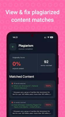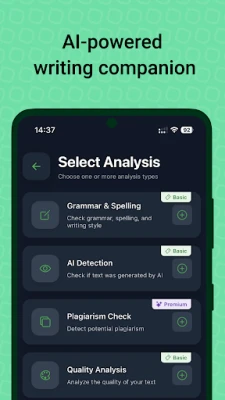 Choose which analyses to run based on your needs and usage limits. Get detailed, interactive results that highlight specific issues in your text. Premium features include AI-powered fixes like rephrasing plagiarized content or humanizing AI-written text.