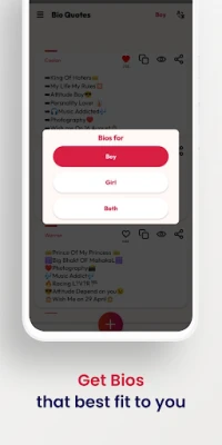 👉 Smart Bio Gender-based filtering helps a boy find attitude bio, and a girl can easily find some cutesy girly bios. If you want to update a bio after fey day then add it to your favorites to make your own private collection.